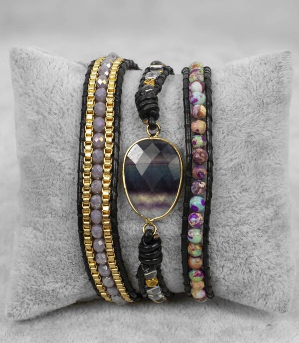 Niezwykle ozdobna bransoletka z kamieni naturalnychWyjątkowo kobiecy dodatek do każdej stylizacjiKamienie umieszczone są na rzemyku z regulowanym zapięciemKilka rzędów małych, kolorowych kamieni z jednym dużym na środkuBransoletka to świetny pomysł na prezent dla bliskiej osoby.Kamienie z których wykonana jest bransoletka to:Jaspis cesarskiAgatKryształkiKoraliki szklane
