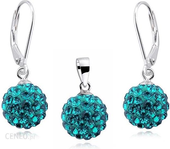 Elegancki wiszący srebrny komplet kulek o średnicy 10mm, wysadzanych niebieskimi kryształkami Swarovski, składający się z kolczyków na angielskim zapięciu oraz wisiorka, model CRH0006DZ10.