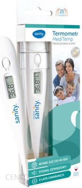 INFORMACJETermometr elektroniczny MediTemp Sanity służy do szybkiego i bezpiecznego pomiaru temperatury. Polecany dla całej rodziny jako świetna alternatywna dla termometrów szklanych. Wynik pojawia się już od 40 sekund od początku pomiaru, w zależności od wybranego sposobu mierzenia temperatury. Krótki czas pomiaru oraz wysoka dokładność sprawiają, że MediTemp sprawdza się w trudnych sytuacjach, gdy konieczne jest monitorowanie temperatury.Właściwości:sygnał dźwiękowy na koniec pomiarufunkcja automatycznego zapisania ostatniego wynikuwskaźnik wymiany baterii na wyświetlaczuautomatyczne wyłączanie: 8 minut ± 2 minutytrwałość baterii: ponad 200 godzin ciągłego działania2 lata gwarancjiPomiaru można dokonać doustnie, rektalnie lub pod pachą. Aby włączyć urządzenie, naciskamy przycisk włączenia / wyłączenia. Termometr powinien wydać krótki sygnał dźwiękowy i przez 2 sekundy wyświetlić test wyświetlacza.Następnie wyświetli się ostatnio zmierzona temperatura ze znakiem „M” w prawym rogu.Na wyświetlaczu pojawi się wskazanie 37,0°C (lub 98,6°F).Gdy wyświetlacz pokaże „Lo” i migającą jednostkę °C (°F), to oznacza, że termometr jest gotowy do pomiaru temperatury.Gdy termometr zakończy pomiar, rozlegnie się sygnał dźwiękowy, a następnie zostanie wyświetlony wynik.Aby wyłączyć termometr, naciskamy przycisk włączenia / wyłączenia (termometr wyłącza się automatycznie po około 10 minutach bezczynności).Termometr powinien być używany tylko pod nadzorem osoby dorosłej.Nie wolno chodzić, biegać i rozmawiać podczas pomiaru temperatury.Światło słoneczne, pył lub wilgoć szkodzi urządzeniu, więc należy unikać skrajnych temperatur i warunków przechowywania.Termometr nie powinien być narażony na żadne wstrząsy.Nie demontować elementów termometru, z wyjątkiem procedury wymiany baterii.Przed i po każdym stosowaniu należy przetrzeć termometr miękką ściereczką z alkoholem izopropylowym rozcieńczonym wodą.Zakres pomiarowy: 32,0°C (89,6°F) ~ 42,9°C (109,2°F)Dokładność pomiaru: ± 0,1°C (0,2°F) w zakresie 35,0°C (95,0°F) ~ 39,0°C (102,2°F), inny zakres: ± 0,2°C (0,4°F)Sygnalizacja dźwiękowa stanu gorączki ≥ 37,8°C (100,0°F): 30 krótkich sygnałów dźwiękowych w ciągu 10 sekundSygnalizacja dźwiękowa normalnej temperatury < 37,8°C (100,0°F): 10 długich sygnałów dźwiękowych w ciągu 10 sekund
